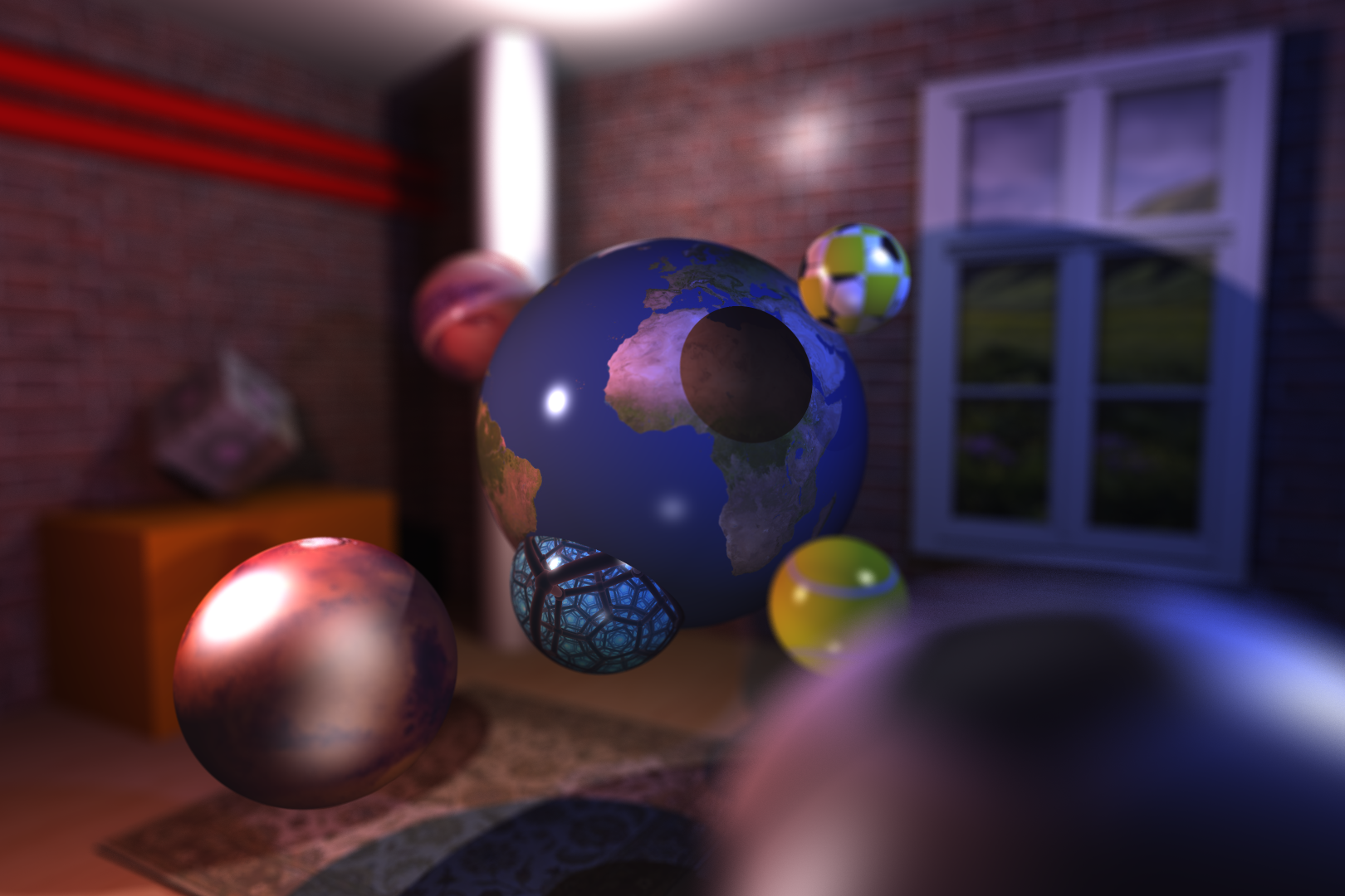 Ce moteur de rendu, a été réalisé entièrement sans librairie mathématiques. De la profondeur de champ au lancé de rayon en passant par l'anti aliasing, tout a été réalisé à la main. Seul la création du fichier png final a été réalisée à l'aide d'OpenCV (pour la structure) et stb-image (pour l'export). Le moteur est entièrement paramétrable et peut charger une scène 3D sous la forme d'un fichier json.