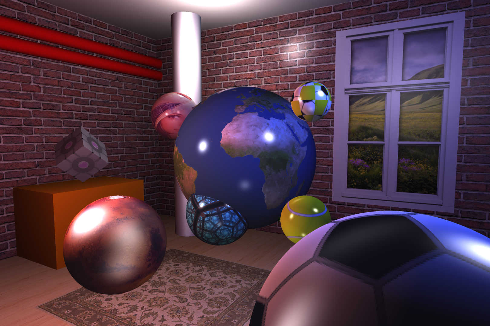 Durant ma 1ère année de Master 3D&JV à l'ESGI, j'ai réalisé un moteur de rendu de raytracing en C++ from scratch. Ce moteur est paramétrable, permet de charger différentes scènes, de rendre différentes primitives tel qu'un cube, une sphère, un cylindre, un plan et un cone, et est partiellement optimisé avec l'implémentation d'instructions SIMD (SSE1).
