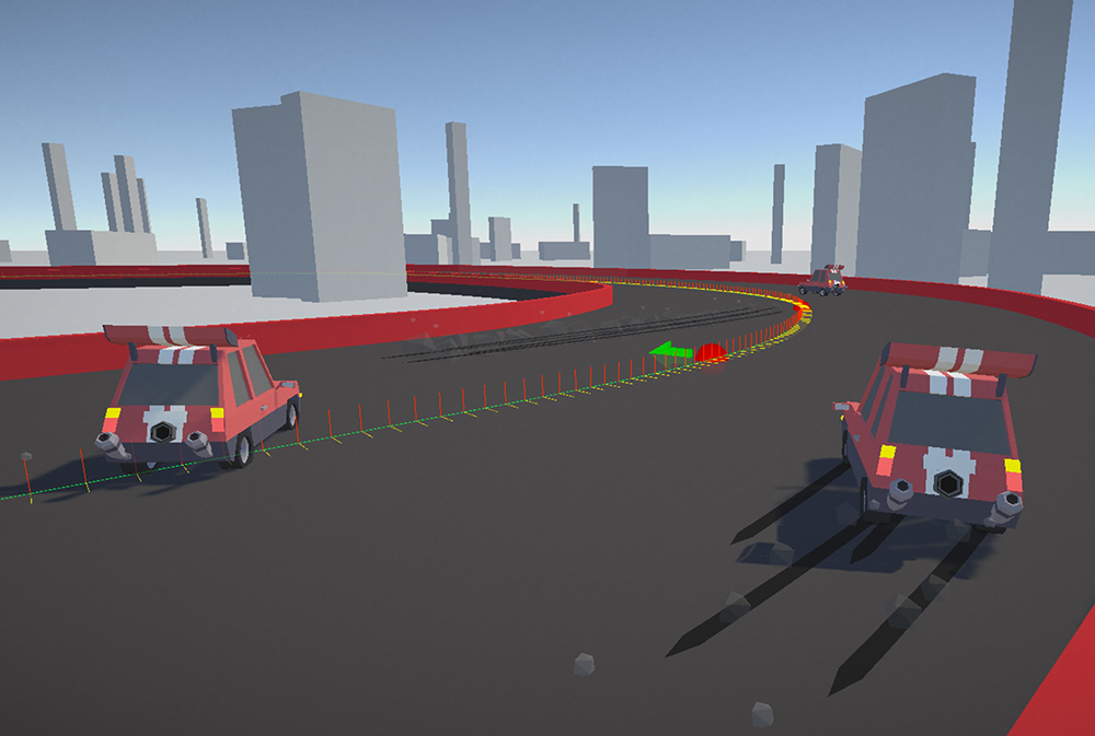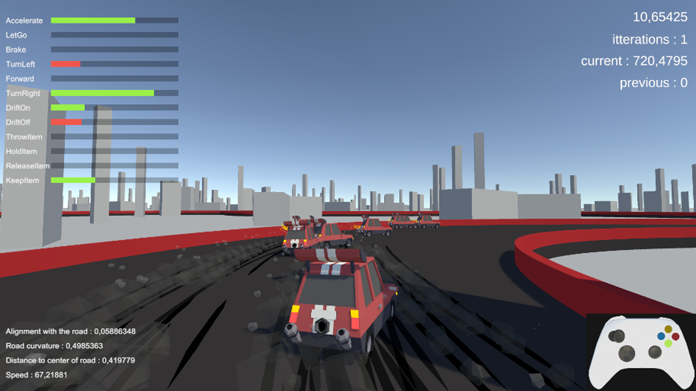 Après plusieurs mois de recherches, voici le fruit de celles-ci. Nous avons réussi a modifier la structure d'une IA dite "Utility AI" ou "Utility System, créé à l'origine pour les Sims en 1999, pour lui permettre de sélectionner plusieurs actions à la fois. De ce fait, l'IA a été rapidement capable de tourner et gérer sa vitesse en même temps, mais aussi de gérer des comportements de dérapage !